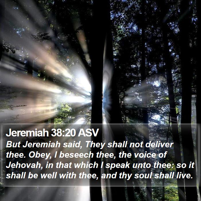 The treatment of Jeremiah in chapter 37 will remind you of the way Jesus suffered. Just as the patriarch Joseph, Jeremiah was raised from a pit. The Lord saw to it that Jeremiah would not die in the dungeon. As the very body of the prophet rises from the pit, the verse for today (38:20) wells up from the mire of disobedience.