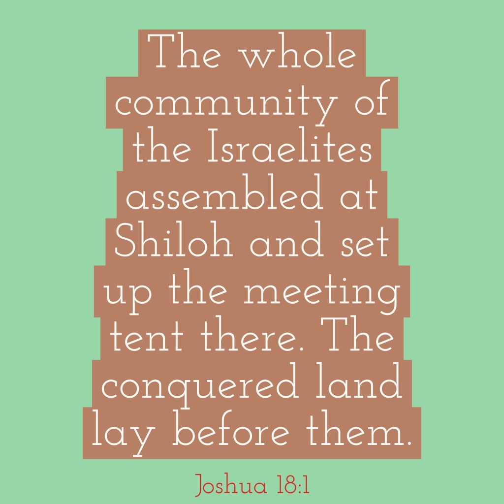 Before these chapters conclude with the rest of the lands apportioned to the remaining tribes, there is a simple notice given in the verse for today: the Ark of the Covenant has come to a place of rest; it has found a home. Just as the capital of a state or country is centrally located, so this city is chosen because it is near the center of the lands the Lord gave to the people. It is about 35 miles north of Jerusalem. The Ark will remain there for over 100 years until the Philistines capture it, as we read in 1 Samuel 4.
