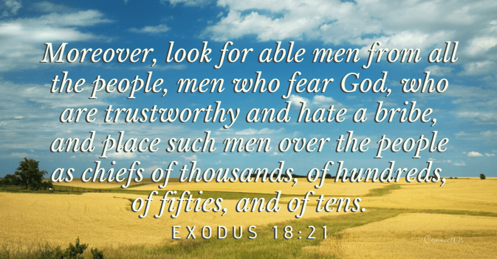 While the Midianites were descendants of Abraham through his concubine Keturah, they were considered as foreigners. However, God is at work in faith in Jethro through Moses’ witness. In addition, Jethro’s outside view of God’s work affords him a perspective often missed by those inside. Jethro suggests that Moses delegate leadership according to the numbers indicated in the verse for the day.