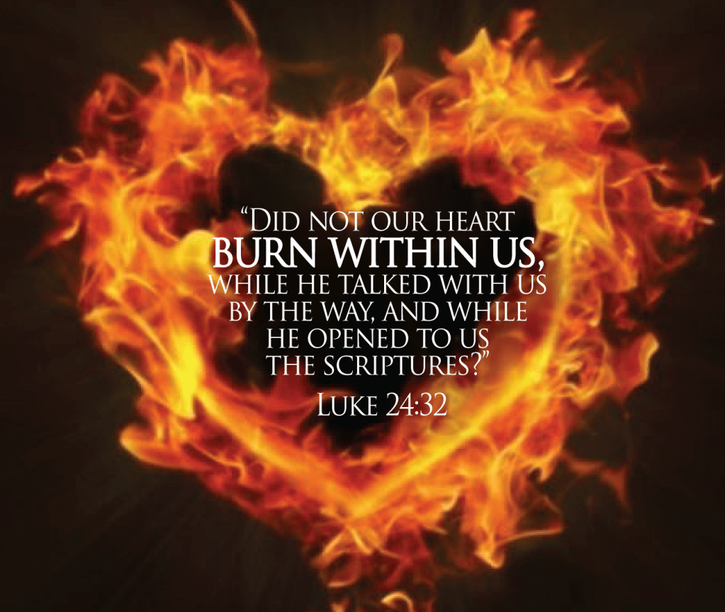Full recognition for them only comes at the breaking of the bread, the Sacrament of encounter that draws them into the presence of Christ by faith. Their hearts, ignited along the way, are now aflame; Jesus is with them. Imagine Jesus walking with you from morning to evening as your heart awakens to joy.