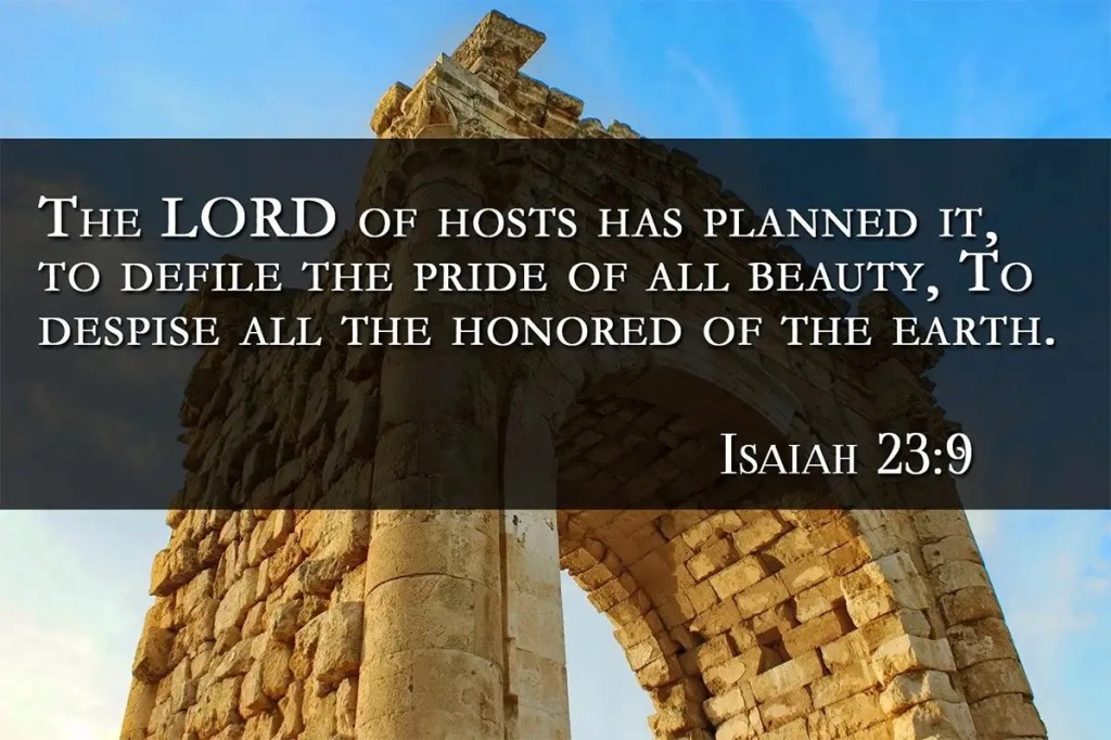 Isaiah’s list of cities proclaimed for downfall concludes with the cities of Tyre and Sidon, merchant centers for ancient Phoenicia. This country, to which we owe the alphabet, becomes bound in persistent pride and arrogance in their worship of false gods. It will mean their destruction.