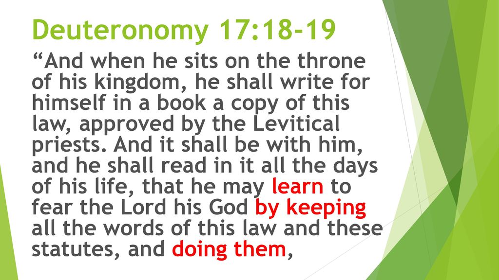Three classes of God’s people are mentioned—priests, prophets and kings. Recall that Samuel, coming at the end of the period of judges, was at the same time the first of the prophets that were to follow. In Christ, you participate in all three classes, because you are engrafted onto his body. Therefore, read this passage by listening to the instructions directed to you in a special way. If the future kings need to read the law every day, how much more must we read, pray, and respond to the Holy Spirit who sets fire in our hearts from the words of Scripture! Is your Bible always close to you?
