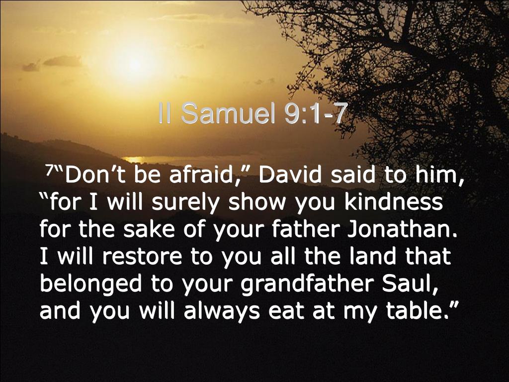 The Lord reaches out to you and takes you as one of his children, not only to eat at his table, but to partake of his body and blood. Be as Mephibosheth and find yourself welcome in intimate communion with the Lord. Who needs your special acts of kindness?