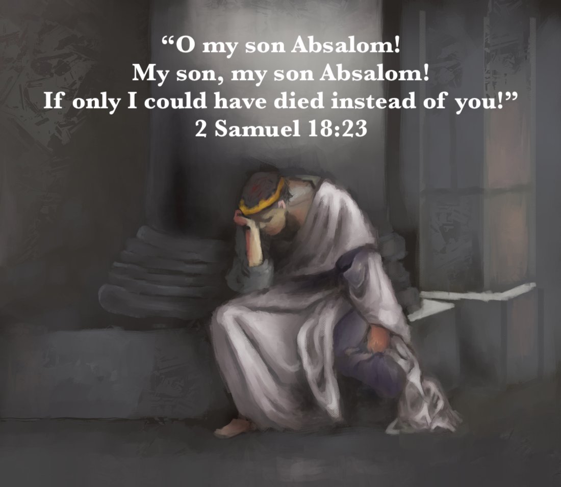 The treason against David reminds me of the same against Jesus on the part of Judas. Absalom, part of David’s family, betrays his father, and wants the power of the kingdom to fall to him. Judas, one of Jesus’s apostles, betrays his Lord. Just as Absalom, Judas does not like the way the lines of power in Jesus’s Kingdom are being drawn. The fates of Absalom and Judas are similar—hanging from a tree. The grief of David over the fate of his son is similar to the grief that Jesus must have felt for Judas’s betrayal and the way he ended. The prayer of David, “If only I had died in your place,” is fulfilled in Jesus who died in your place and mine, so that our sin would not do to us what Absalom’s and Judas’s did to them. The tree, upon which Jesus hung in agony, became a new tree of life.
