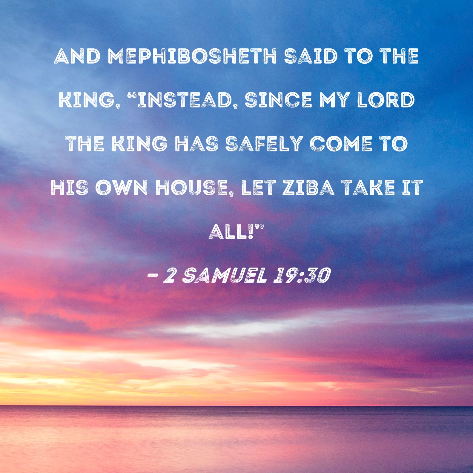 Power, division, and disloyalty continue, eventually resulting in the two separate kingdoms of Israel and Judah after the death of Solomon. “I am content just to have you back again, my lord!” 19:30. This verse comes from the lips of Mephibosheth, Saul’s grandson whom David had taken as his own. The return of King David is all that Mephibosheth wants; everything else can go. The presence of the Lord Christ in your heart—what else do you need?