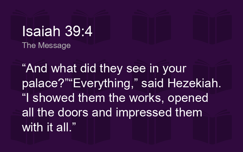 Our last taste of Hezekiah is in his weakness. Look at the final verse of the reading. He displays the treasures of the kingdom to foreigners. He has no boundaries. He reveals precious articles intended only for the worship of the Lord, to a people with no respect for God. Jesus would say that he is “Giving pearls to swine” (Matt. 7:6).