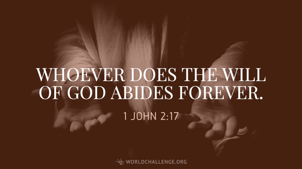 Whatever is your assessment of spiritual growth, the words in verses 15–17 need to be taken to heart. Reflect upon what is passing in your life and what lasts forever. Take the three-fold assessment that John makes of the world and meditate on them until their truth comes home to you. Take this with you today and always: “He who does the will of God abides forever.”