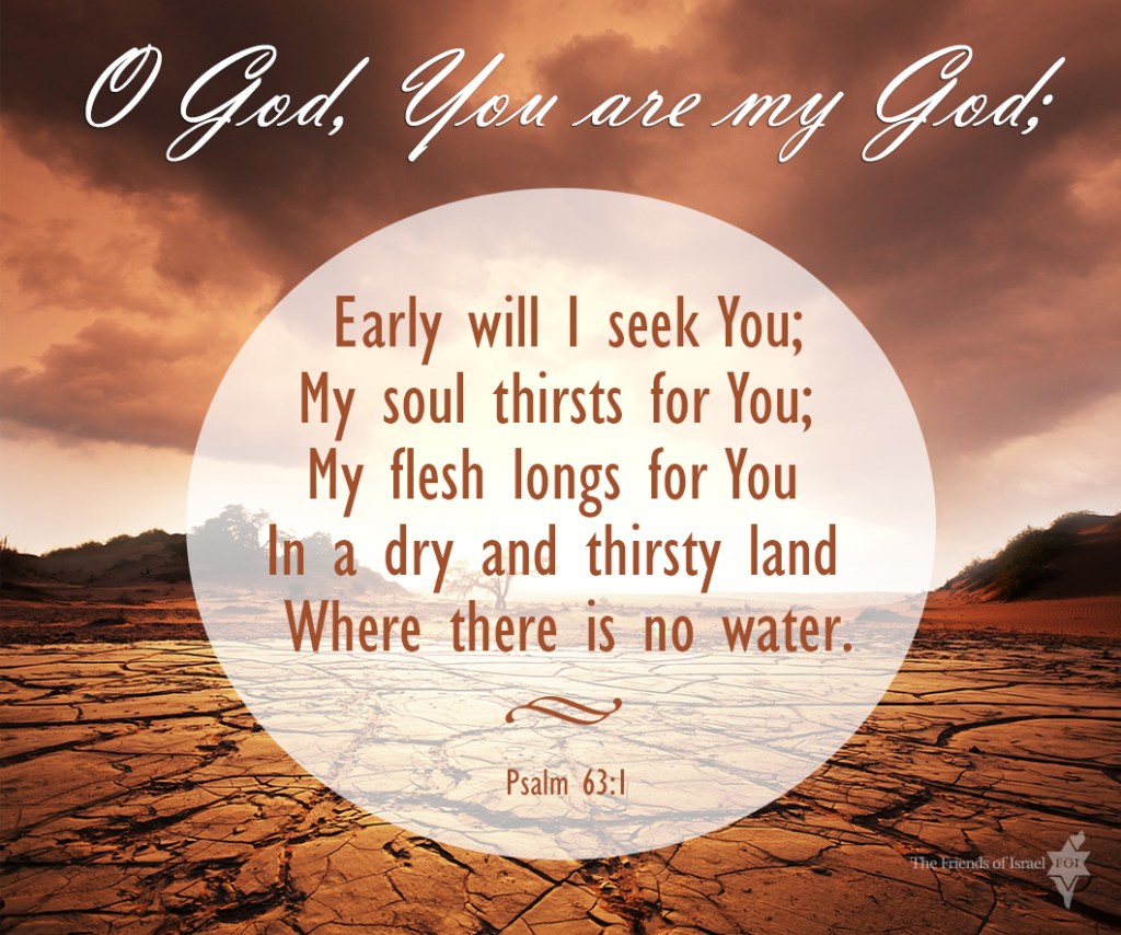 David is hiding in the wilderness from his son, Absalom. Just as his ancestors in the wilderness and Jesus in the desert, it is a place of spiritual retreat for him. The starkness of the setting prevents distractions that would keep him from seeking God. He is thirsty there, in the desert, but even more does his soul thirst for the Lord. “My soul thirsts for you; my flesh longs for you.”