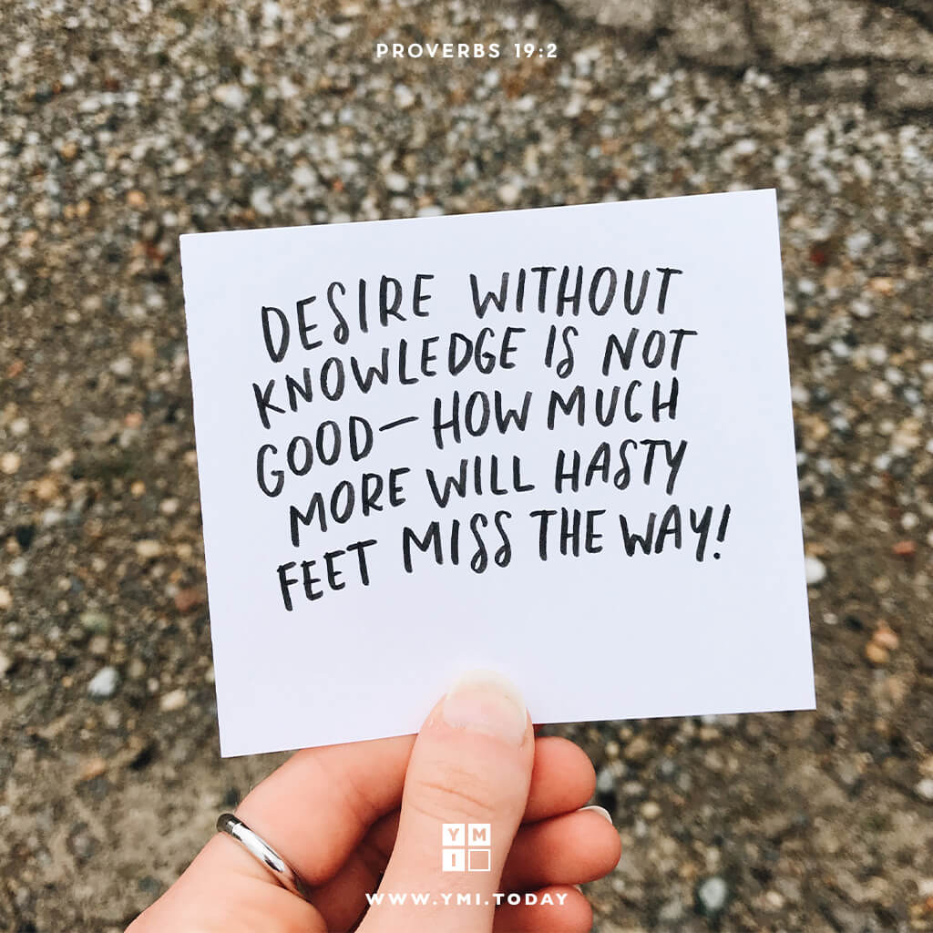 Verse 2 catches the essence of this, noting the danger of hastiness with one’s feet, before one has knowledge. Wisdom is an inner spiritual knowledge that takes time to receive. Do not be rushed when you read Proverbs. Go slowly. You will be richly rewarded.