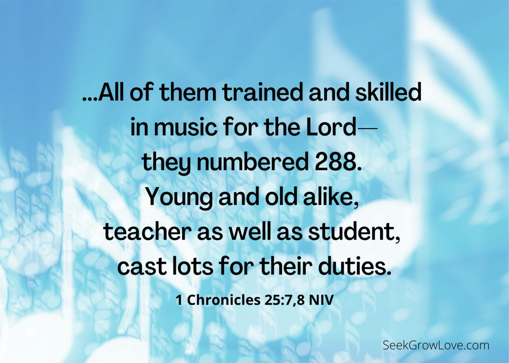 This passage lists the names of those assigned sacred charges in the life of worship—priests, musicians, and gatekeepers. The roster was designed by lot—twenty-four groupings, each group taking a two-week period a year.